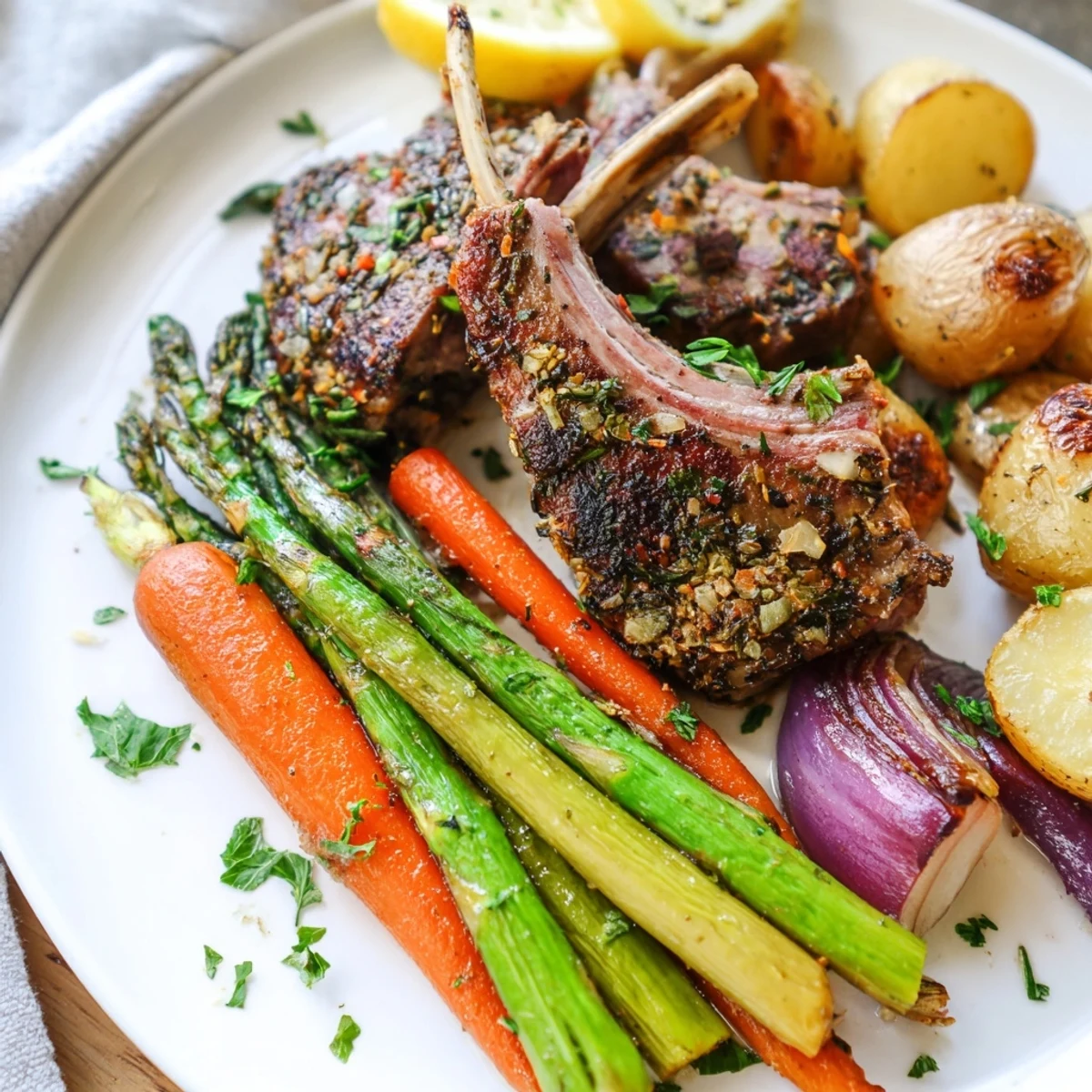 Asparagus, baby potatoes, carrots, and red onions are perfect choices as they roast at similar rates and complement the lamb. Feel free to add radishes, snap peas, or Brussels sprouts based on seasonal availability.