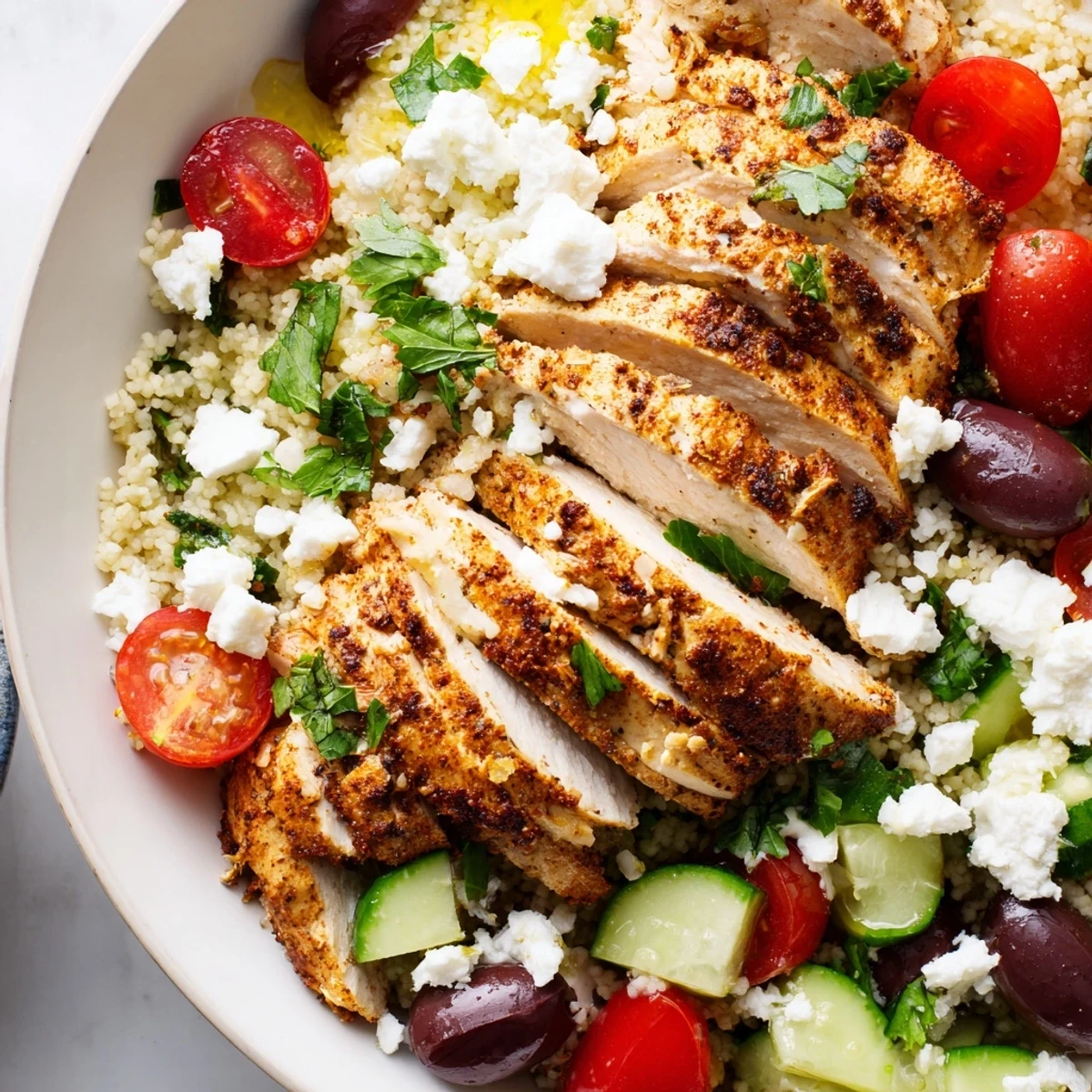 This wholesome bowl brings together tender chicken breasts marinated in classic Mediterranean spices—cumin, smoked paprika, oregano, and coriander—then grilled to golden perfection. The fluffy couscous absorbs savory chicken broth, while cherry tomatoes, crisp cucumber, red onion, and briny Kalamata olives add fresh, vibrant textures. A creamy lemon-tahini drizzle ties everything together with its rich, nutty brightness. Perfect for meal prep and easily adaptable for gluten-free or dairy-free preferences.